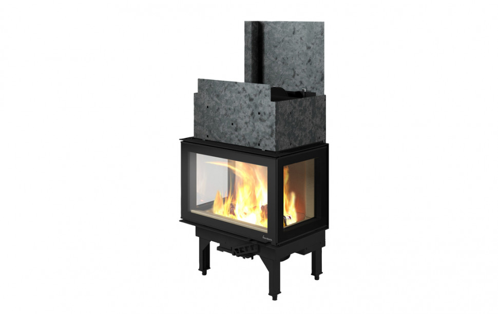Прекрасно подойдет для обустройства камина в гостиной комнате. Боковая стенка и дверца имеют двойные стекла, с нанесением теплоотражающего покрытия, которое направляет тепловую энергию внутрь топки, что позволяет стеклу оставаться чистым, а процесс сгорания дров становится более эффективным. Футеровка топки выполнена из специальной жаростойкой керамики Аккумотт. Для большей теплоотдачи, можно дополнительно приобрести теплоаккумулирующий комплект.