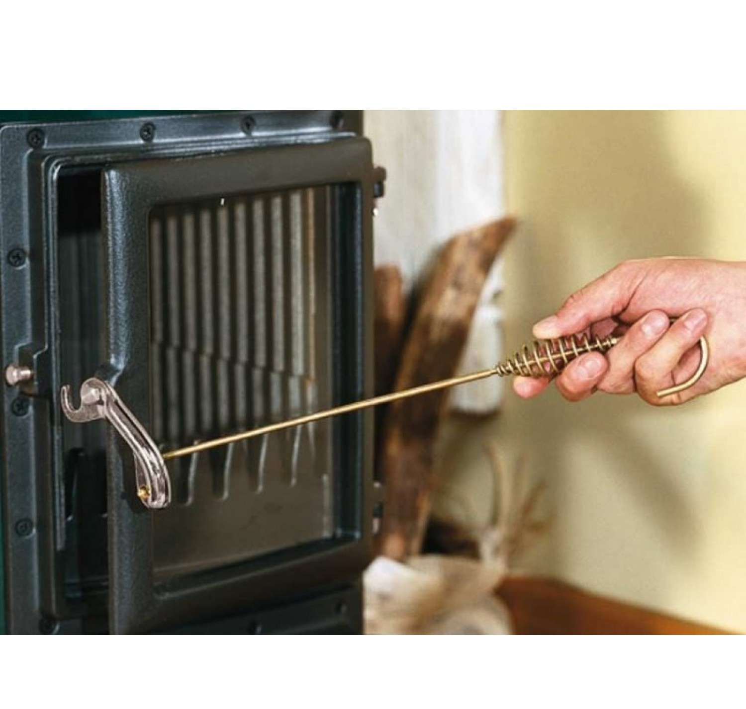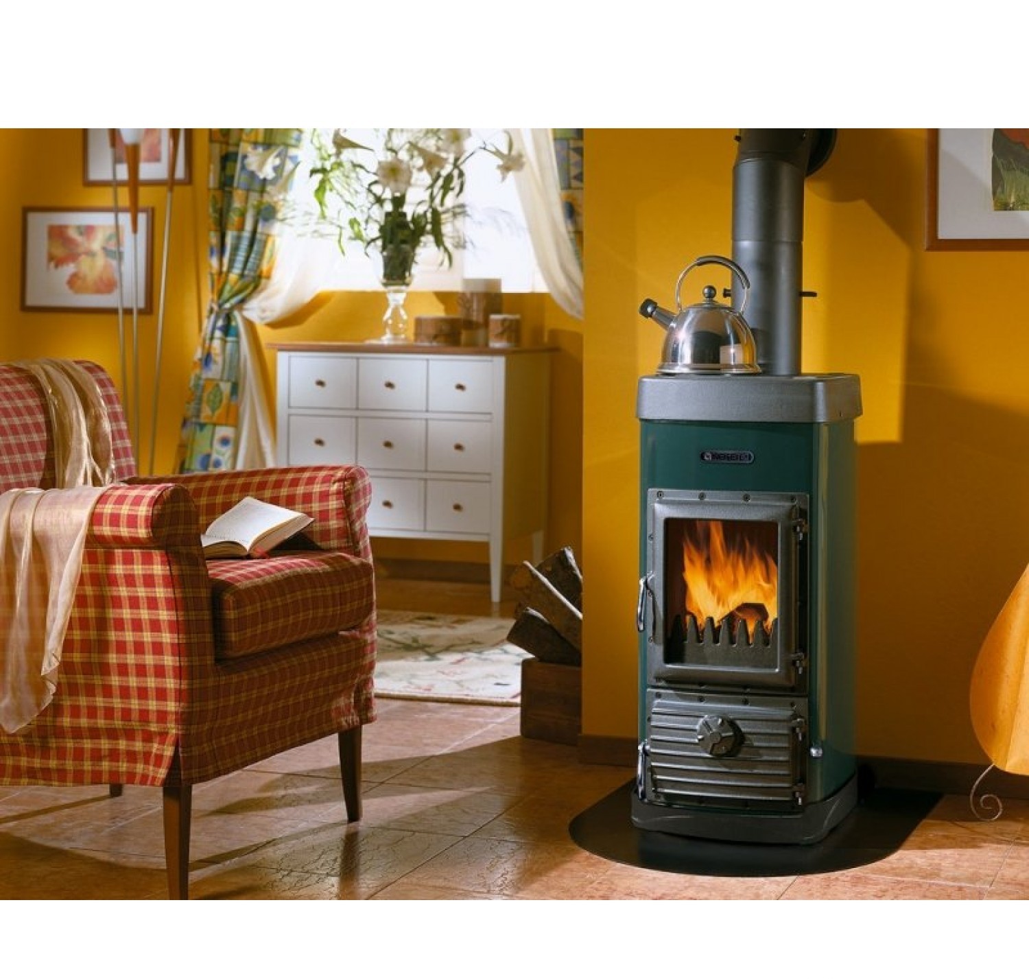 Наружная поверхность печи покрыта матовой эмалированной сталью черного или зеленого цвета. Дверца и плита выполнены из чугуна . Панорамная дверь позволяет легко загружать топливо и любоваться живым пламенем. Важно отметить, что дверца может открываться книжкой.