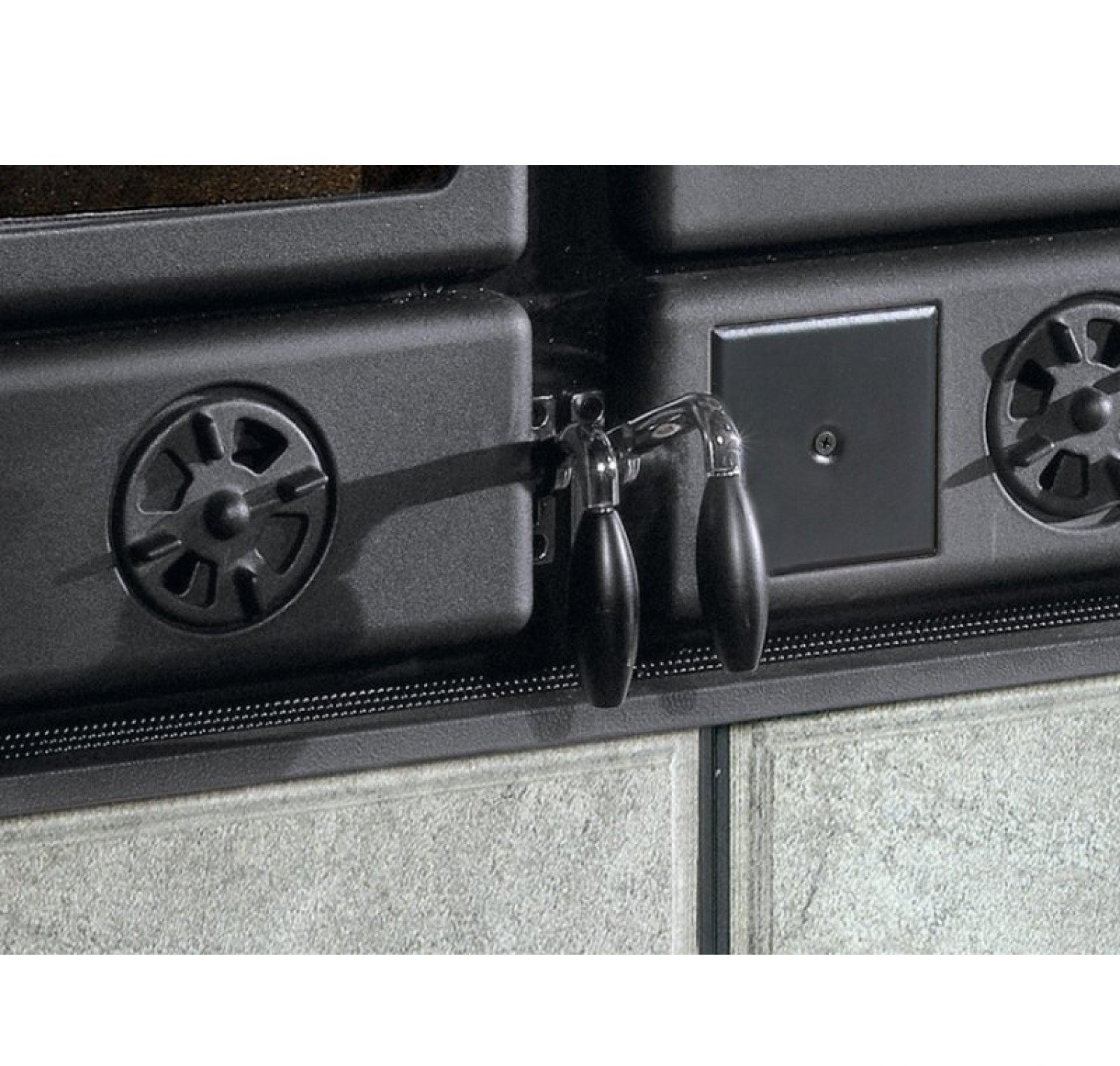 Устройство оснащено крупной духовкой и одноконфорочной варочной поверхностью. Топка агрегата выполнена из чугуна и снабжена панорамным стеклом крупного размера. Конструкцией предусмотрен ящик для складирования и просушки поленьев. Рама, кольца и пластины модели изготовлены из чугуна. Имеется система регулировки воздуха (первичного и вторичного).