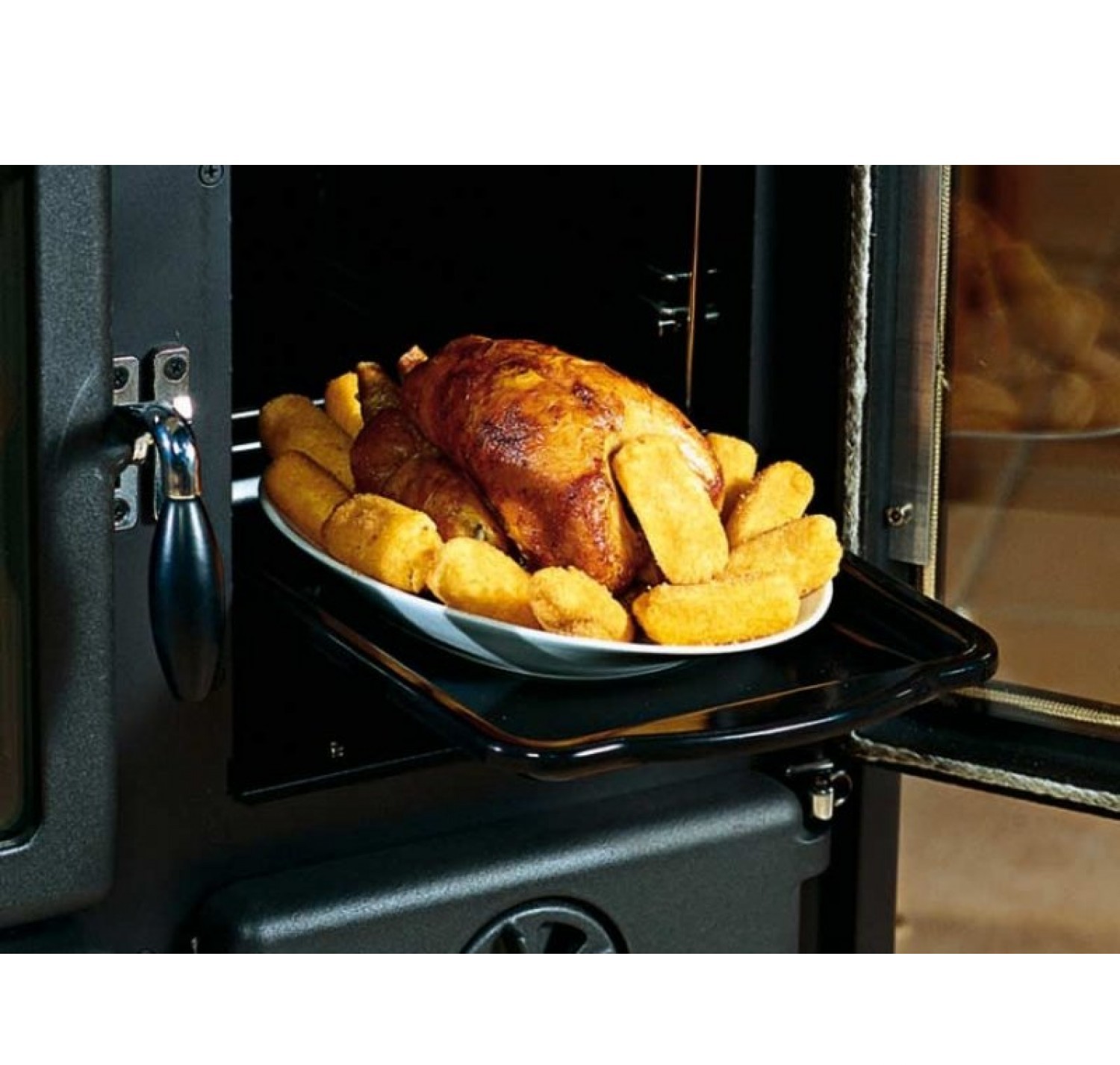 Агрегат оснащен системами регулировки подачи первичных и вторичных воздушных масс. Пластины, кольца и рама печи изготовлены из чугуна. В качестве топлива используются дрова или гранулы. Расход дров в среднем составляет 2 кг в час. Модель оборудована вместительной духовкой и одноконфорочной варочной панелью. Чугунная топка снабжена дверцей со стеклокерамической вставкой. Предусмотрена также вместительная дровница.