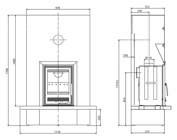 - Диаметр дымохода, (мм) 150