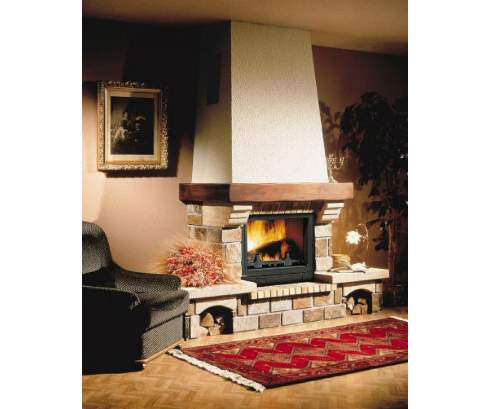 Пристенный фронтальный камин в стиле кантри модели Chevannes смотрится величественно и стильно. Камин изготовлен из ракушечника и необработанного бута. Верхняя балка выполнена из массива дерева. По бокам от топки две удобные полки, под ними – отделения для хранения дров.