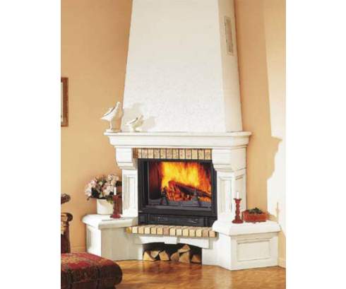 Угловой камин из белого Эдельрока. Может быть изготовлен из золотисто-песочного Edelroc.