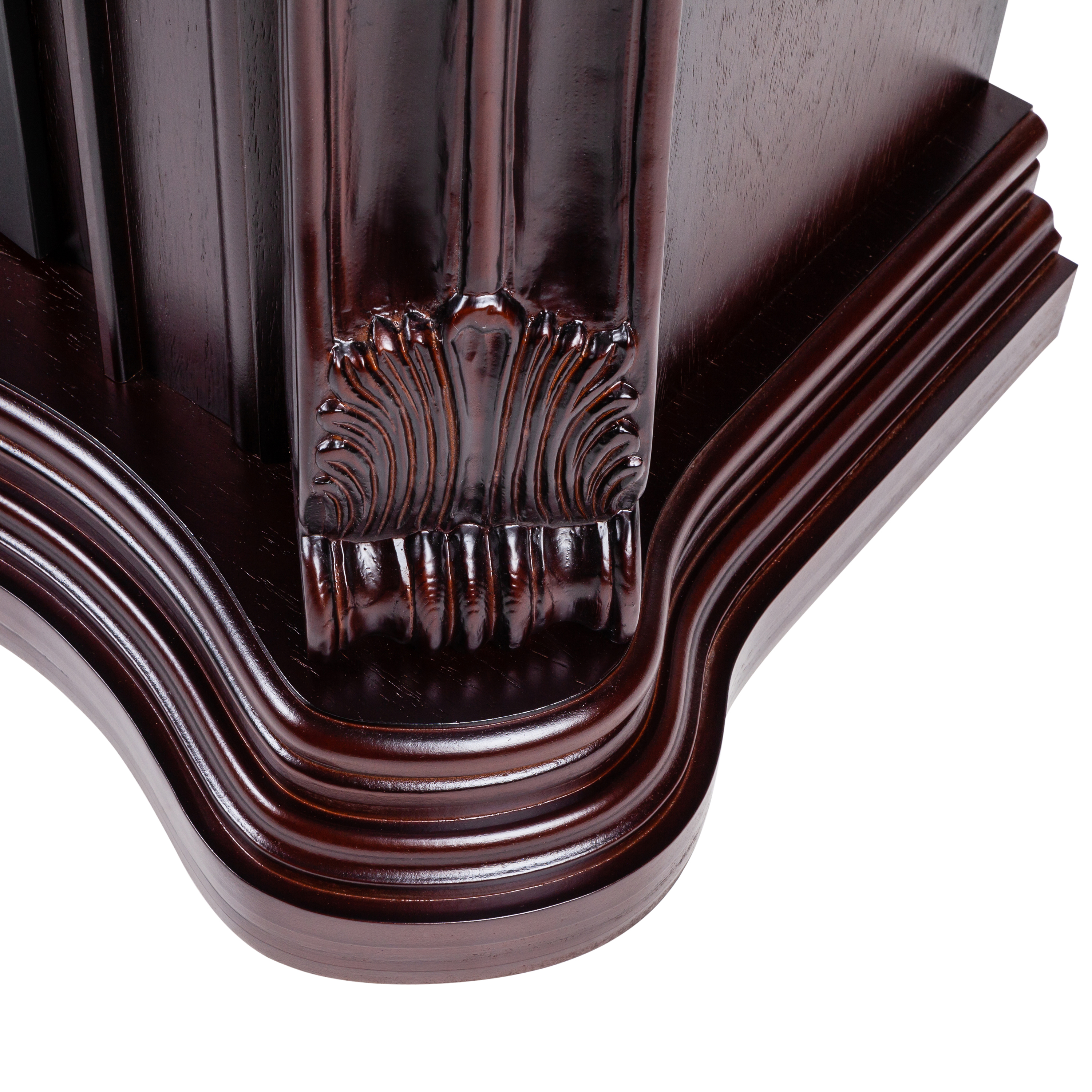 - Выполнен из качественного МДФ и тонированного шпона. Украшен резьбой по дереву и колоннами.