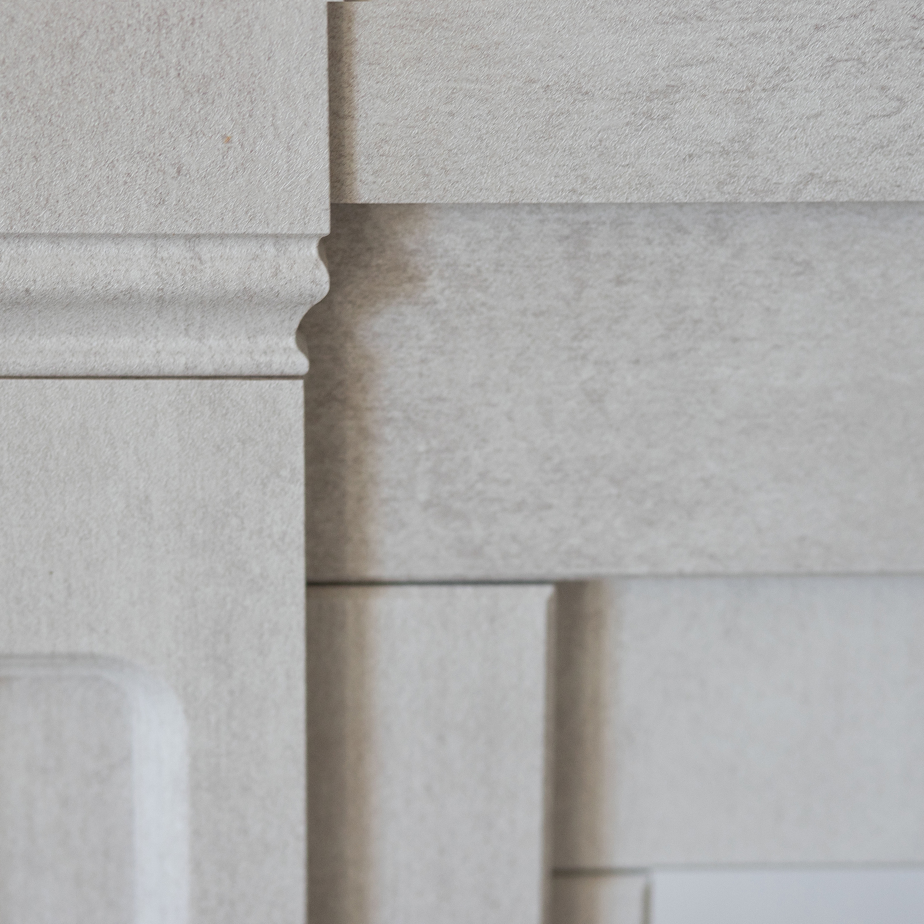 - Портал станет ярким акцентом современного интерьера, благодаря лаконичности форм и оригинальности текстуры. Сдержанный дизайн обрамления с элементами замкового стиля подчеркивается природной фактурой под натуральный камень. Такой камин добавит в обстановку комнаты солидности, а светлый оттенок портала визуально не перегрузит пространство.