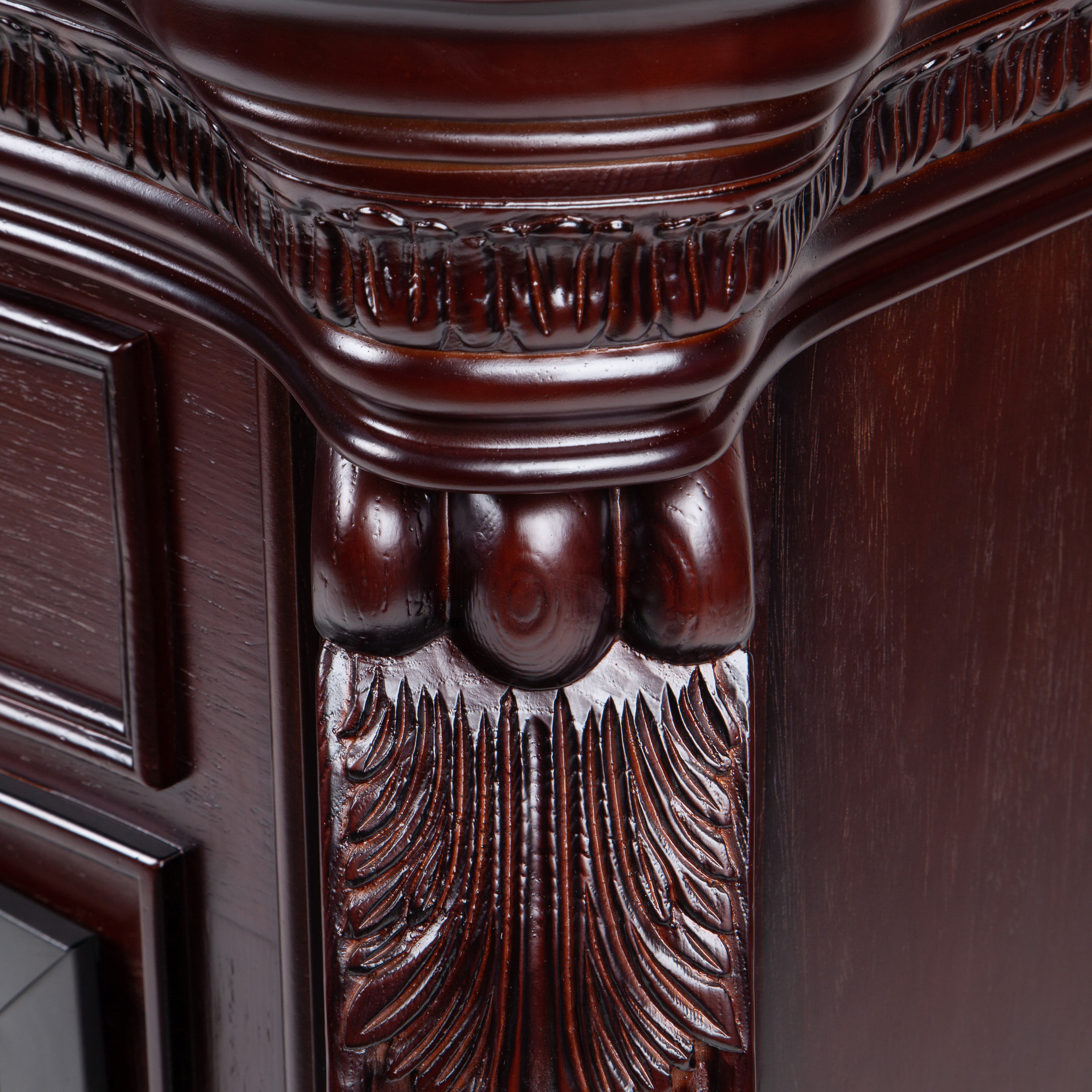 - Обрамление из МДФ и тонированного шпона. Украшен декоративными резными элементами по всей поверхности.