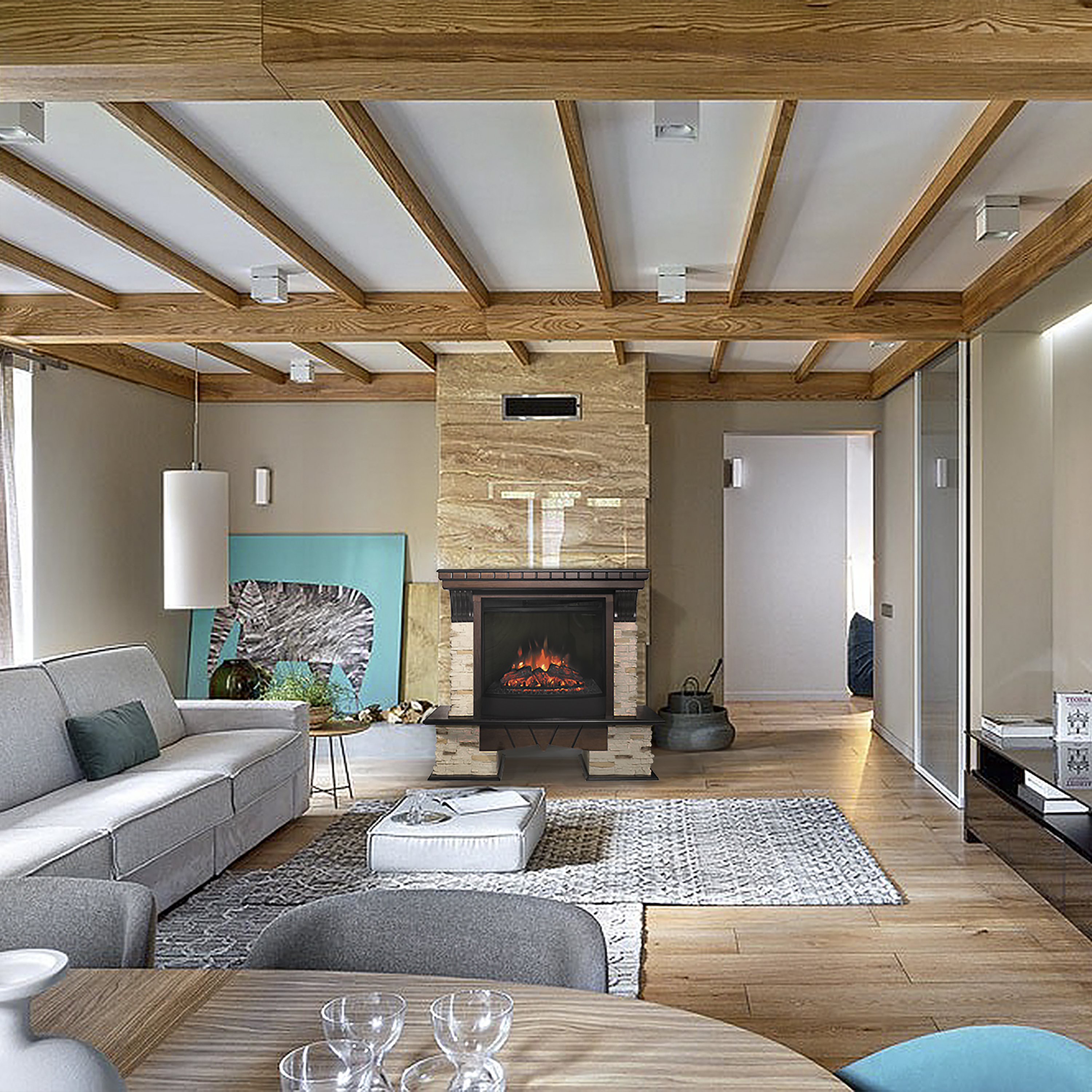Каминокомплект включает в себя обрамление Rockland AO-257 - античный дуб + камень и функциональный очаг Evrika 25.5. Великолепный эффект пламени притягивает к себе внимание с первых секунд.