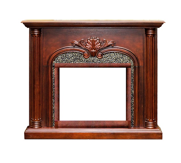 - Изящная резная отделка и панель под металл вокруг очага. Колонны делают обрамление более привлекательным. По центру портала красивый растительный узор.