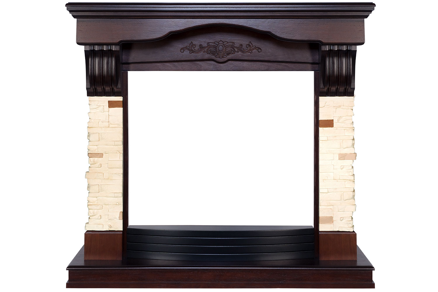 Портал Malta – классическая модель с изысканным арочным сводом над зоной очага и резными декоративными элементами в античном стиле. Деревянный постамент и столешница темных оттенков дерева эффектно контрастируют с боковыми колоннами из светлого камня.