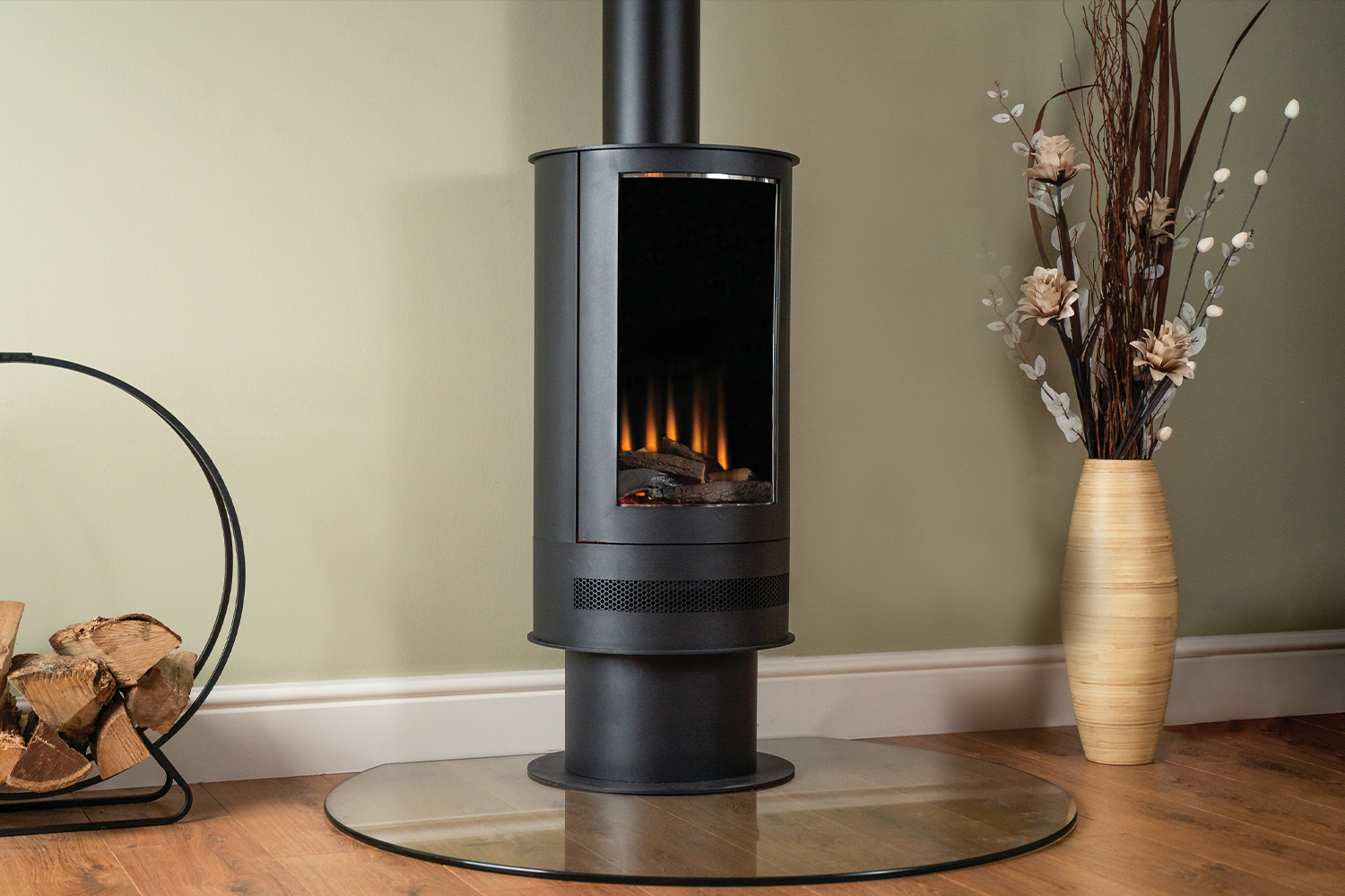 Этот электрокамин отличается уникальным скандинавским дизайном цилиндрической формы, который идеально впишется в интерьер любого помещения. Его ультрареалистичный дизайн создает эффект настоящего огня, а открывающаяся дверка скрывает панель управления, делая его еще более эстетичным.