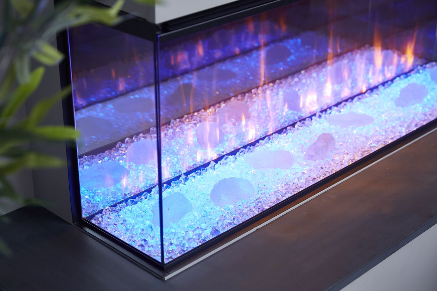 - Функция верхней подсветки: Освещает декоративные элементы (дрова и кристаллы), создавая отражение на задней зеркальной стенке, что усиливает визуальную глубину топки.