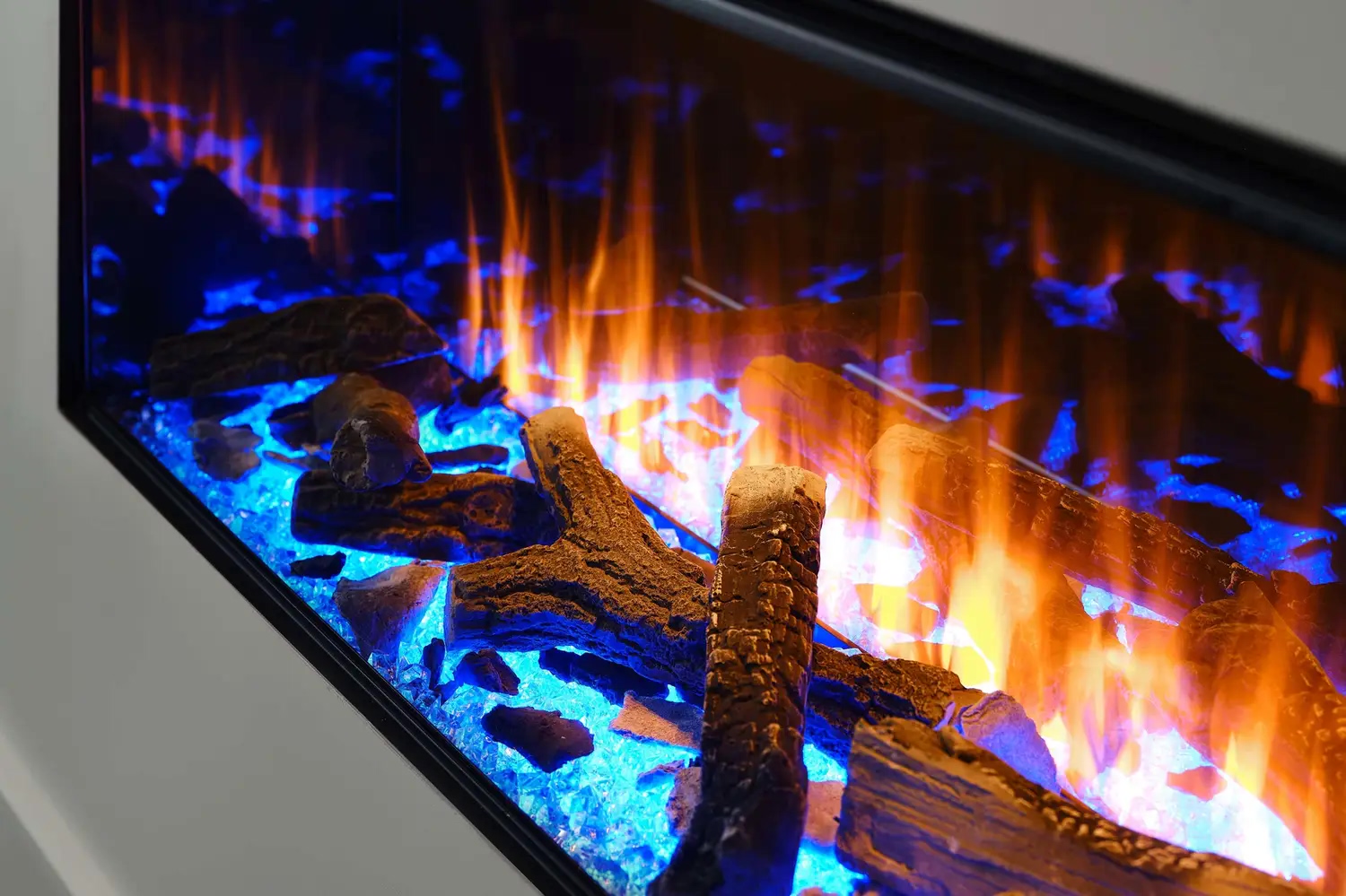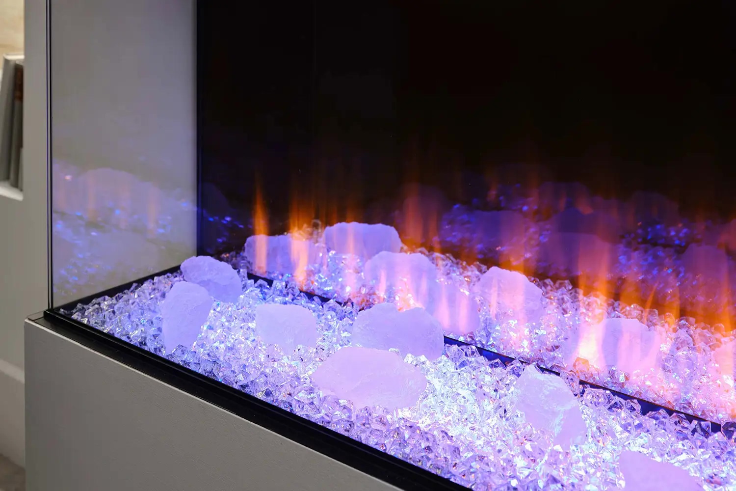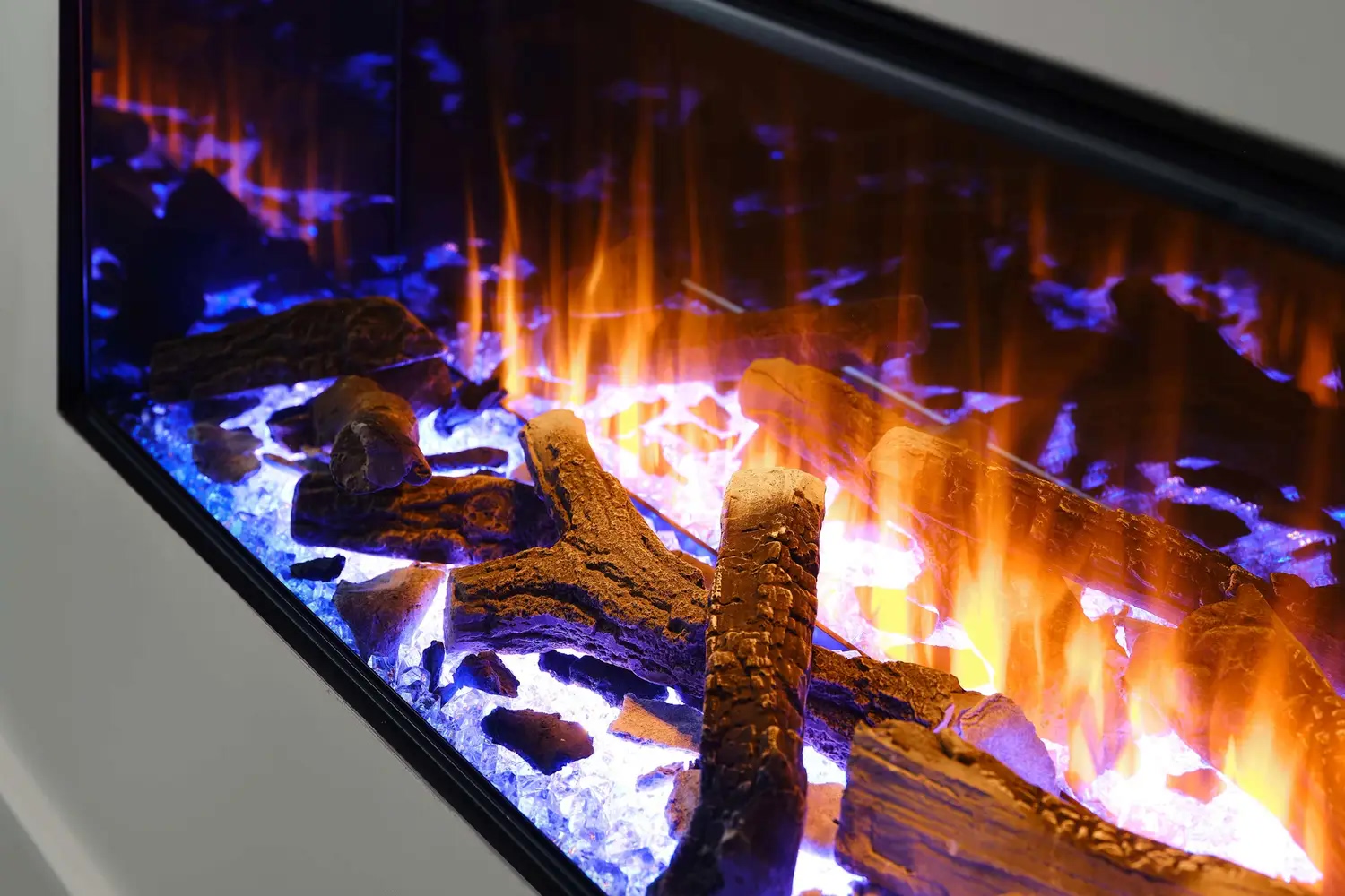 - Функция верхней подсветки: Освещает декоративные элементы (дрова и кристаллы), создавая отражение на задней зеркальной стенке, что усиливает визуальную глубину топки.