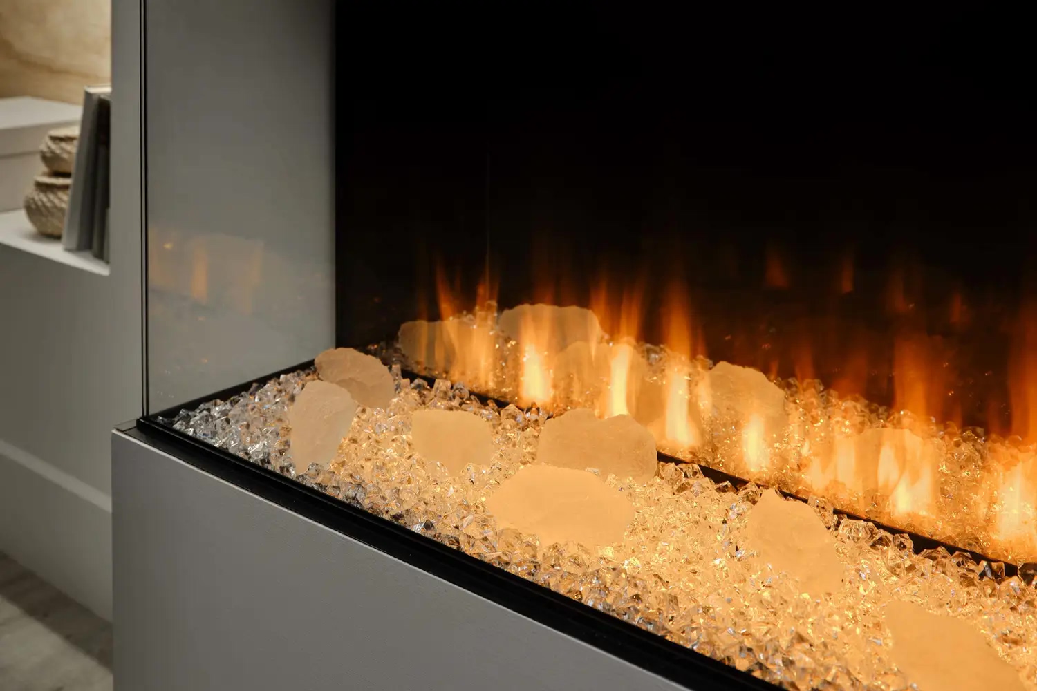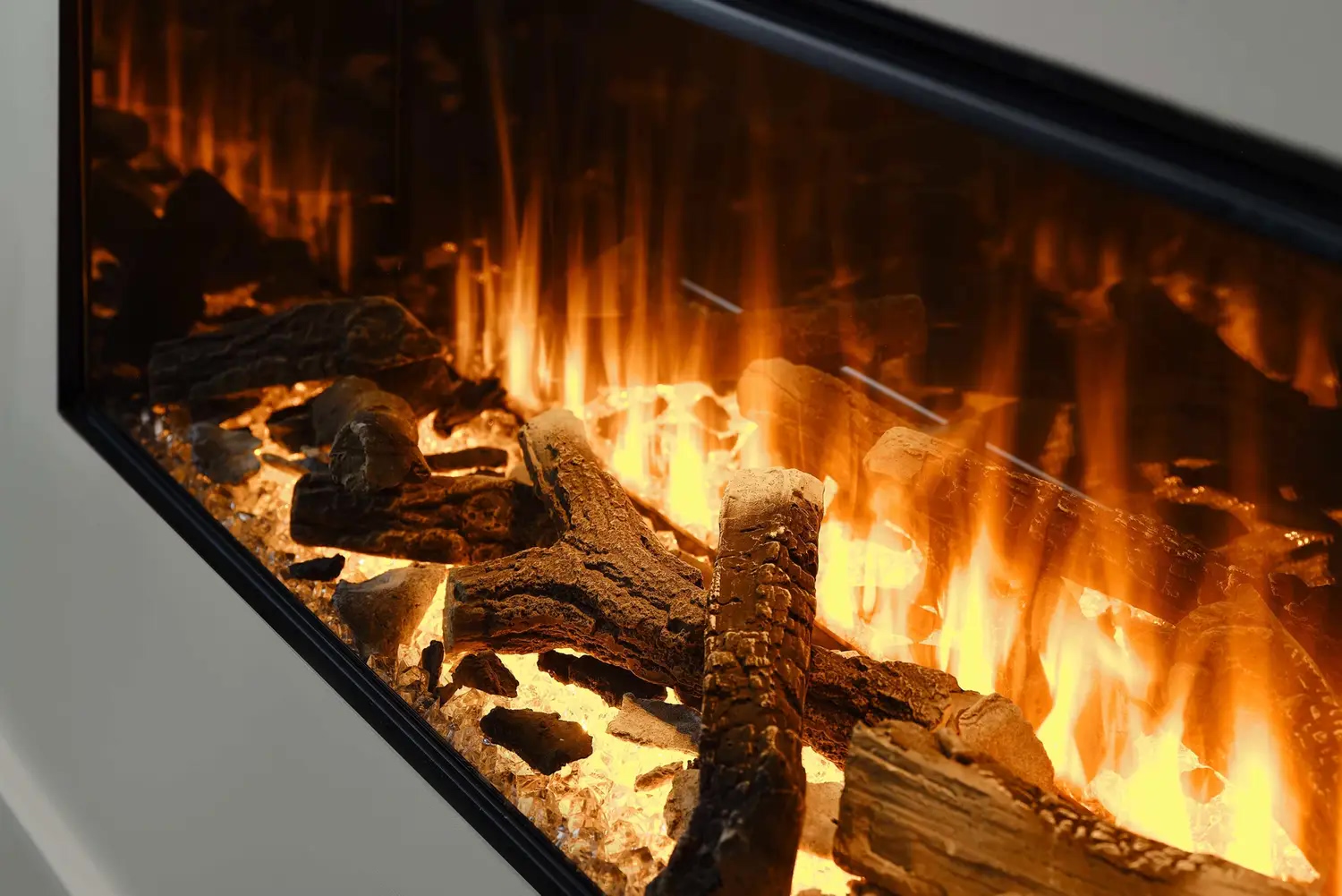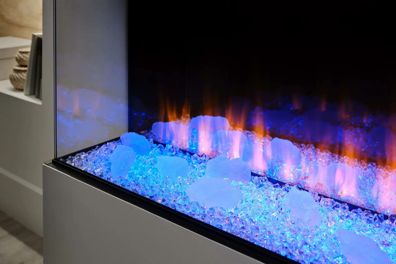 - Функция верхней подсветки: Освещает декоративные элементы (дрова и кристаллы), создавая отражение на задней зеркальной стенке, что усиливает визуальную глубину топки.
