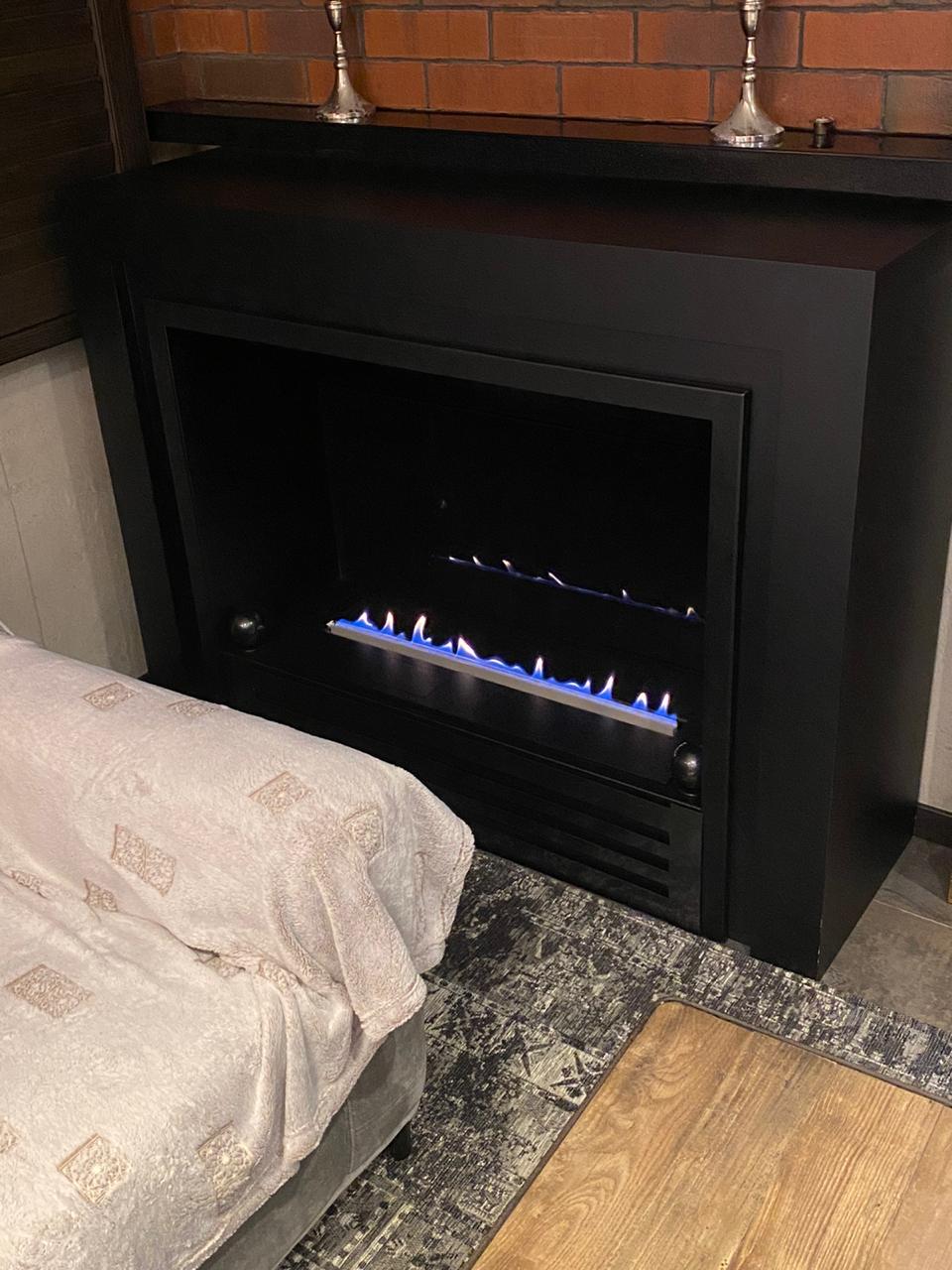Сделали портал из МДФ черного матового цвета и изготовили корпус очага из металла, и в качестве горелки установили автоматический топливный блок со следующими характеристиками: